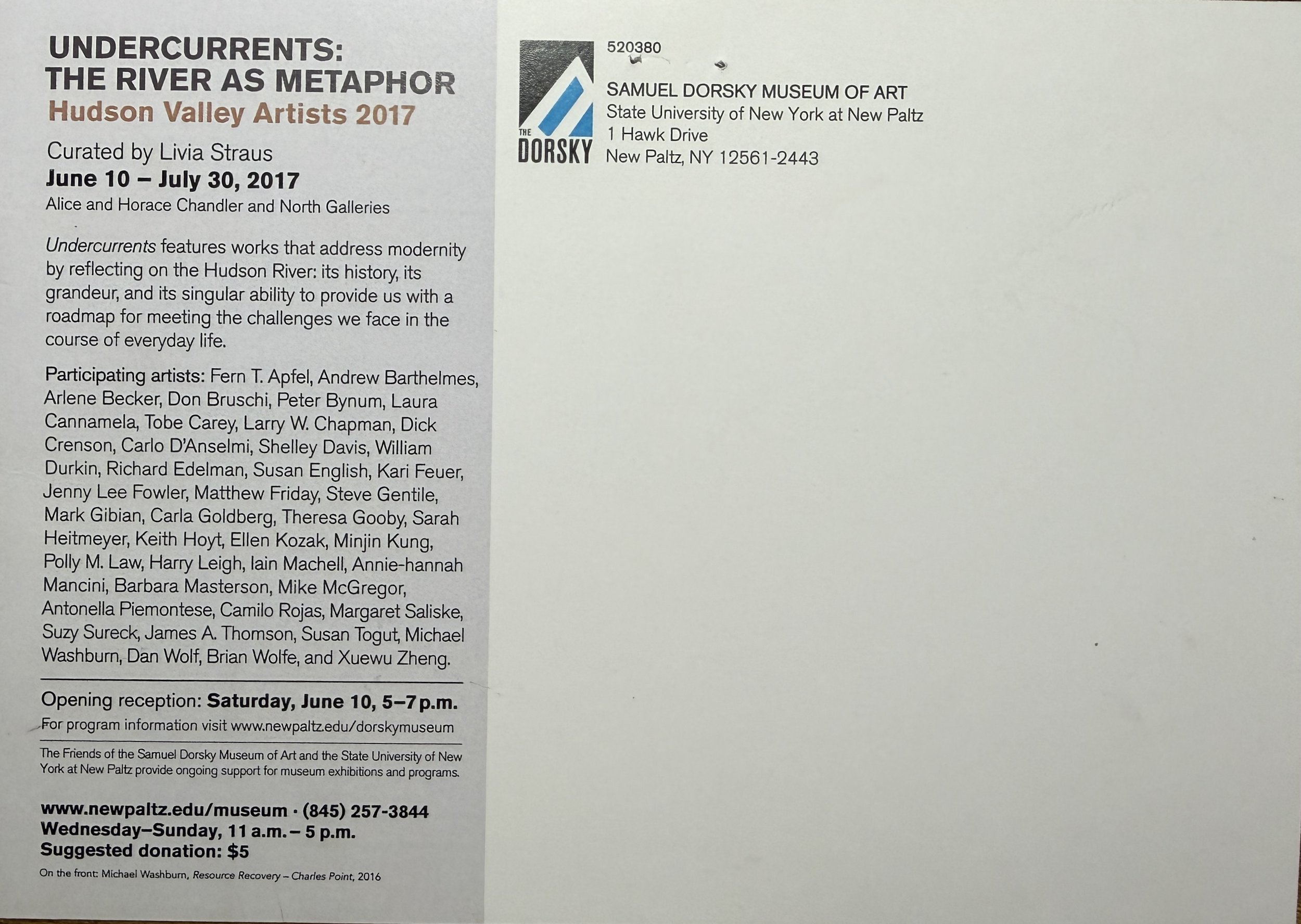 Undercurrents: The River as Metaphor / Hudson Valley Artists 2017 will exhibit works that address modernity by reflecting on the Hudson River: its history, its grandeur, and its singular ability to provide us with a roadmap for meeting the challenges we face in the course of everyday life. The exhibition poses questions intended to document this work in our own time: What are the perspectives of contemporary artists living along the Hudson River, and how are they reflected in their art? Can we look to the history of the Hudson Valley to anchor our moral fiber? How can the river and the artists it inspires guide us through the ongoing process of adjusting to new norms and realities?
